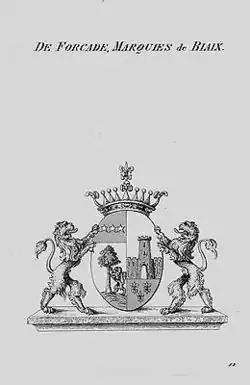 Heraldic symbolism: The lion symbolizes courage; the eradicated oak tree symbolizes strength and endurance; the towers are symbols of defense and of individual fortitude; the mullets (5-star) symbolizes divine quality bestowed by god; the rose is a symbol of hope and joy; the fleur-de-lis is the floral emblem of France; the coronet is a symbol of victory, sovereignty and empire. A count's coronet to demonstrate rank and because the family originally served the counts of Foix and Béarn during the English Wars in the Middle Ages.