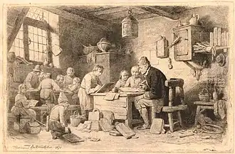 Ferdinand de Braekeleer was born in a poor family.[3] After his parents died, he was admitted to the school for orphans and children of poor parents established by the prominent Antwerp painter Mattheus Ignatius van Bree in Antwerp in 1807. At the school, de Brakeleer received artistic training as well as reading classes. De Bree rewarded good students with money and gifts.[2][4] De Brakeleer was a good pupil and continued his education at the Royal Academy for Fine Arts of Antwerp where van Bree was also a teacher. He excelled as a pupil and received several prizes in 1809 and 1811.[2]