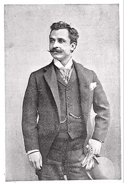 In 1897, he sang in a state concert at London's Buckingham Palace to mark Queen Victoria's Royal Jubilee.[17] At the Costanzi Theatre, Rome, on 22 November 1898, he created the role of Osaka in Mascagni's Iris,[18] and at Covent Garden on 12 July 1900 he played Cavaradossi in the first performance of Tosca in England, supporting the Floria Tosca of Milka Ternina, with Antonio Scotti as Scarpia and Luigi Mancinelli conducting.[19] The "Musical Times" found that his performance was highly effective and that his character exactly suited that of Cavaradossi.[20]