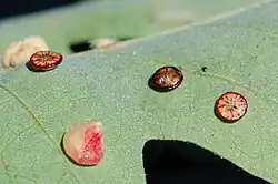 | The galls formed by Feron kingi (bottom left) and Feron parmula (across center) on an oak leaf | |