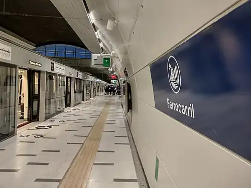 Ferrocarril is an underground metro station of Line 3 of the Santiago Metro network, in Santiago, Chile. It is an underground, between the Lo Cruzat and Los Libertadores stations on Line 3. It is located at the intersection of Manuel Antonio Matta Avenue with Pasaje 4.