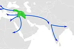 The studies further suggest a diffusion of this diverse population away from the Fertile Crescent, with the early migrants moving away from the Near East—westward into Europe and North Africa, northward to Crimea, and northeastward to Mongolia.[19] They took their agricultural practices with them and interbred with the hunter-gatherers whom they subsequently came in contact with while perpetuating their farming practices. This supports prior genetic[27][28][29][30][31] and archaeological[19][32][33][34][35][36] studies which have all arrived at the same conclusion.