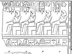In a small room off of the main hall, there is a room referred to as the Chamber of Ancestors, where a large inscription, the Karnak king list, shows Thutmose III making offerings to his 61 ancestors. The originals of these were removed and are now located in the Louvre in Paris.[4]