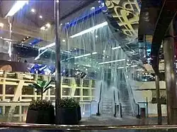 At approximately 9:00 pm (0800 GMT) on 30 March 2014 hailstones the size of golf-balls shattered the ceiling windows of Festival Walk during a heavy thunderstorm, causing rain to pour straight into the interior of the mall.[14][15] Some sections of interior ceiling collapsed and ankle-deep flooding was reported. Water from the shopping mall overflowed into the attached railway station.[16] Mapletree Greater China Commercial Trust Management, the manager of Mapletree Greater China Commercial Trust, which owns Festival Walk, said its staff were on site to render assistance.[17] However, mall management were criticised for failing to alert the public through the mall's website and via relevant social media networks. Evacuation of the public was also done poorly, as at 10:00 pm the public was still on scene sending live images to social media networks.