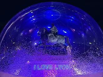 ![]() The artwork « I love Lyon » staging Louis XIV’s equestrian statue of place Bellecour during the 2024 edition of Lyon’s Festival of Lights. This work, already exposed during the 2006 and 2007 editions of the event, has become a symbol of the festival and of the city’s touristic promotion to a great extent. | |