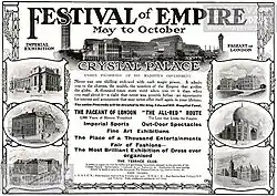 The 1911 Festival of Empire was the biggest single event held at the Crystal Palace in London since its opening. It opened on 12 May and was one of the events to celebrate the coronation of King George V. The original intention had been that Edward VII would open it in 1910, however, this was postponed after his death shortly before the planned opening day. The Festival contained a display of landscapes and exhibits from the British Empire, mainly the dominion countries, to encourage emigration to those nations; and it contained a large scale pageant dramatising British history.[1] It was described at the time as 'a social gathering of the British family' encouraging the 'firmer welding of those invisible bonds which hold together the greatest empire the world has ever known'.[2] It has since been described as the 'ultimate imperialist propaganda showcase'.[3]