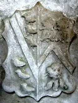 Sir Hugh Luttrell (c. 1364 – 1428) (son of Sir Andrew Luttrell by his wife Lady Elizabeth Courtenay).[22] He married Catherine Beaumont (died 1435),[23] daughter of Sir John Beaumont (died 1379/80)[24] of Shirwell and Saunton in North Devon, MP for Devon 1376-80,[25] a substantial landowner in Devon, by his second wife Joan Crawthorne, granddaughter and heiress of Sir Robert Stockey, MP in 1318, of Crawthorne and Cranstone.[26] Alabaster effigies survive in Dunster Church of himself and his wife, badly mutilated.[27] The arms of Beaumont (Barry of six vair and gules) appear in Dunster Church and on the Luttrell Table Carpet, c.1520, now in the collection of the Burrell Collection in Glasgow (see below).