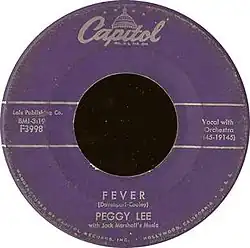 "Fever" is a song written by Eddie Cooley and Otis Blackwell, who used the pseudonym "John Davenport". It was originally recorded by the American R&B singer Little Willie John for his debut album, Fever (1956), and released as a single in April of the same year. The song topped the Billboard R&B Best Sellers in the US and peaked at number 24 on the Billboard pop chart.[1] It was received positively by music critics and was included on several lists of the best songs when it was released.