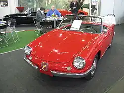 There was also a very rare Zagato Spyder version produced, only between two and four examples are believed to have been built.[10] This model was first shown at the 1957 Turin Auto Show, and it was then shown again the next year.[10] The design has the usual sleek Zagato front end, with distinct fins at the rear. The bump on the engine lid came in for some period critique for disfiguring the overall design.[11] Max power from Abarth's 747 cc (45.6 cu in) engine is 44 CV (32 kW; 43 hp), enough for a top speed of 153 km/h (95 mph) in a period road test or 145 km/h (90 mph) according to Abarth themselves.[10][11][12] The Spyder's list price in Italy was the same as for the berlinetta Zagato, 1,535,000 Lira in 1958.[4] The 1958 Turin Show car had the twin cam engine, with similar performance to the berlinetta, although the "little castle" disfiguring the engine lid was even larger on this model.[13]