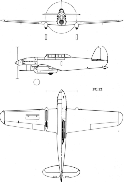 The FC.12 was powered by a 450 kW (600 hp) FIAT A.30 R.A. liquid-cooled V-12 engine, fitted with a chin radiator. The two crew had tandem seats, the aft one behind the wing trailing edge, under a multi-framed canopy. The horizontal tail was elliptical in plan and mounted on top of the fuselage. Fin and rudder were similarly shaped, with the rudder ending at the upper fuselage. All the rear control surfaces were horn balanced and the elevators carried tabs. There was a small, faired tailwheel on the extreme fuselage.[1]