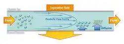 Field-flow fractionation, abbreviated FFF,[1] is a separation technique invented by J. Calvin Giddings. The technique is based on separation of colloidal or high molecular weight substances in liquid solutions, flowing through the separation platform, which does not have a stationary phase. It is similar to liquid chromatography, as it works on dilute solutions or suspensions of the solute, carried by a flowing eluent. Separation is achieved by applying a field (hydraulic, centrifugal,[2] thermal,[3] electric,[4] magnetic,[5] gravitational, ...) or cross-flow, perpendicular to the direction of transport of the sample, which is pumped through a long and narrow laminar channel. The field exerts a force on the sample components, concentrating them towards one of the channel walls, which is called accumulation wall.[6] The force interacts with a property of the sample, thereby the separation occurs, in other words, the components show differing "mobilities" under the force exerted by the crossing field. As an example, for the hydraulic, or cross-flow FFF method, the property driving separation is the translational diffusion coefficient or the hydrodynamic size. For a thermal field (heating one wall and cooling the other), it is the ratio of the thermal and the translational diffusion coefficient.