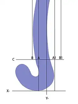 The maximum permitted 'deviation' is shown by the lines B-B and B1-B1 respectively. The line B-B is 20 mm further along the X- axis than the line A-A and the line B1-B1 is 20 mm further along the X+ axis than the line A1-A1. There is no limit to the length of a protrusion along the y-axis specified, so the deviation curve or curves may be of any length along the length of the stick-handle. Some goalkeeping sticks have an outward curve on the toe side (within the line B-B) that extends for almost half the total length of the stick.