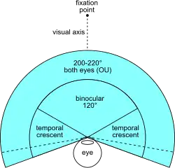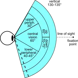 If the analogy of the eye's retina working as a sensor is drawn upon, the corresponding concept in human (and much of animal vision) is the visual field.[2] It is defined as "the number of degrees of visual angle during stable fixation of the eyes".[3] Note that eye movements are excluded in the visual field's definition. Humans have a slightly over 210-degree forward-facing horizontal arc of their visual field (i.e. without eye movements),[4][5][6] (with eye movements included it is slightly larger, as you can try for yourself by wiggling a finger on the side), while some birds have a complete or nearly complete 360-degree visual field. The vertical range of the visual field in humans is around 150 degrees.[4]