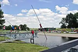 A jump consists of a sprint to the pole (polsstok), jumping and grabbing it, then climbing to the top of the pole while trying to control its forward and lateral movements over a body of water, and finishing by landing on a sand bed opposite to the starting point.[1]