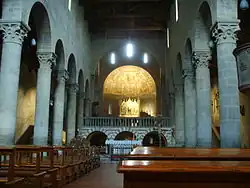 The interior has little decoration, apart from the marble altar (1273) and two frescoes, depicting Saint Benedict (c. 1420) and Saint Sebastian by Pietro Perugino (late 15th century). In the presbytery is a polyptych of the Three stories of Saint Nicholas, by Bicci di Lorenzo, commissioned in 1450. In the Salutati Chapel is the funerary monument of bishop Leonardo Salutati, executed by Mino da Fiesole.[3] In the Canon's Chapel is a marble altar by Andrea Ferrucci (1492–1494).