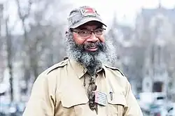 |  Filep Karma wearing his East Timorese hat and West Papuan flag as his clothing pin. | |