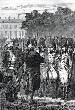 Excusing himself due to the extreme heat, Pétion then goes down to the terrace. He was poorly received there by the loyalist National Guards of the Filles de Saint Thomas Battalion. From then on, he thinks only of taking shelter. The guards keep him by force and he is only released after repeated orders from the king. Reluctantly, in his capacity as mayor, Pétion signs the order to repel force if the castle is attacked.[8]