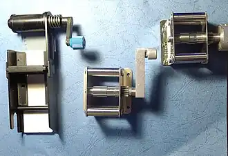 A film slitter, sometimes also called film splitter, is a device used in subminiature photography to slit 135 or 120 roll film into 16mm film or Minox film for use in subminiature cameras.[1] [2]