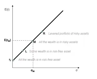 In general, then, while portfolio theory studies how investors should balance risk and return when investing in many assets or securities, the CAPM is more focused, describing how, in equilibrium, markets set the prices of assets in relation to how risky they are. [note 9] This result will be independent of the investor's level of risk aversion and assumed utility function, thus providing a readily determined discount rate for corporate finance decision makers as above,[36] and for other investors. The argument proceeds as follows:[37] If one can construct an efficient frontier – i.e. each combination of assets offering the best possible expected level of return for its level of risk, see diagram – then mean-variance efficient portfolios can be formed simply as a combination of holdings of the risk-free asset and the "market portfolio" (the Mutual fund separation theorem), with the combinations here plotting as the capital market line, or CML. Then, given this CML, the required return on a risky security will be independent of the investor's utility function, and solely determined by its covariance ("beta") with aggregate, i.e. market, risk. This is because investors here can then maximize utility through leverage as opposed to stock selection; see Separation property (finance), Markowitz model § Choosing the best portfolio and CML diagram aside. As can be seen in the formula aside, this result is consistent with the preceding, equaling the riskless return plus an adjustment for risk.[5] A more modern, direct, derivation is as described at the bottom of this section; which can be generalized to derive other equilibrium-pricing models.