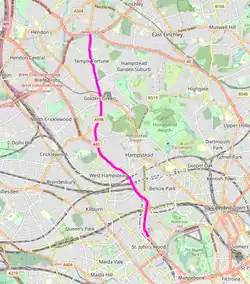 The new route (now the A41) started from what was then called the 'New Road' (the first London bypass) and is now Marylebone Road, and ran north, first along what are now Park Road and Wellington Road, and becomes Finchley Road at St John's Wood tube station. It goes north through Swiss Cottage, then turns slightly north west, forming an unofficial boundary between Hampstead and West Hampstead, and then turns north again at Child's Hill. The A41 diverges westward and Finchley Road becomes the A598. It continues past Golders Green Underground station (where it meets the old route), through Temple Fortune to the North Circular Road, crossing it at Henlys Corner, where it becomes Regents Park Road (perhaps after the southern end of the route). This continues as Ballards Lane through Finchley Central to North Finchley. There it joins the former Great North Road (now the A1000).