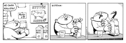 ![]() An example of wordplay in Fingerpori. In this strip, the main character Heimo Vesa buys regular "maito" saying "No onpa kallista!", "Well that's expensive!" when seeing the price of "kyytön maito". "Kyyttö" is a rare Finnish breed of cattle, "kyytön maito" is "kyyttö's milk". The wording can also be read as follows: "kyy" is "viper", "-tön" is a privative suffix, and "kyytön" is "viperless". | |