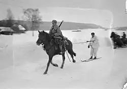 Horses were a central asset to Finnish military forces during the Winter War (1939–1940) and Continuation War (1941–1944), when tens of thousands of horses were the main locomotive power of the army due to the shortage of automobiles.[99][100] Animals were procured from private owners in a systematic procedure, but to ensure the continuity of Finnhorse breeding, neither stallions nor any nursing, pregnant or studbook-approved mares were enrolled to be eligible for military procurement.[99][101][102] All procured horses officially remained their private owners' property, were marked for identification and as necessary, were returned or reported dead.[102] The program was successful in preserving the breed, as the horse population rebounded to its pre-war count of over 380,000 animals as soon as 1945.[103]