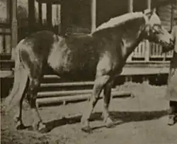 Because of the vigorous colour breeding for chestnut in the early 20th century, combined with a genetic bottleneck resulting from the low number of Finnhorses that existed in the 1980s, colours such as grey and cream dilutions were preserved only by a few minor breeders. In the 1980s there were fewer than ten grey and palomino Finnhorses combined.[9] All Finnhorse carriers of the cream gene today descend from a single maternal line, founded by the palomino mare Voikko (literally, "Palomino") who lived in the 1920s.[20] While both cream dilution and black are rare, there are some known smoky blacks in the breed, the first of which was a filly foaled in 2009, identified as smoky black and confirmed as such by a DNA test in 2010.[21][22][23] The filly is considered "if not the first ever, at least the first in a long long time."[21] In April 2010, a filly appearing to be a double cream dilute was born, sired by a buckskin and out of a palomino. She was blue-eyed and had "pink skin and very pale coat", and was officially recognised as a double cream dilute.[6][24][25][26][27][28]