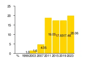 The Finns Party's popularity initially continued to rise after the 2011 election: in one opinion poll from June 2011 gave the party a record popularity of 23 percent.[30] The party's membership rose to over 8,000 members by 2013[31] (up from circa 5,500 in 2011[32] and circa 1,000 in 2005[33]). Membership in the party's youth organisation rose as well, going from 800 before the 2011 election[34] to over 2,200 in 2013.[35]