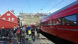 In summer, it is possible to walk or cycle to Finse on the Rallarvegen rail trail, which stretches from Myrdal station or Flåm to Finse's west to Haugastøl station to its east. Originally built around the turn of the twentieth century as an access road for the workers constructing the railway, Rallarvegen has been open to the public as a bicycle trail since 1974 following a volunteer effort in the 1960s and 1970s. Motorised vehicles are permitted only by application in order to prevent damage to the trail.[7] A railway navvy museum is located near the station, displaying exhibits concerning the construction of the railway line as well as two decommissioned snow-clearing engines which visitors are free to explore.