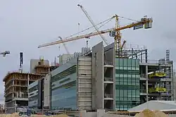The entire health campus, comprising several buildings, was designed by the Fiona Stanley Hospital Design Collaboration, a joint venture between the local offices of three architectural practices Silver Thomas Hanley,[6] Hames Sharley[7] and Hassell. After the appointment of the three firms in 2007, construction commenced in 2009, which was estimated to have cost A$2 billion, equivalent to A$2.46 billion in 2022. The directors responsible for the project from each firm were Giorgio Raffa, Warren Kerr and Jeff Menkens. The managing contractor for the project was Multiplex.[8]