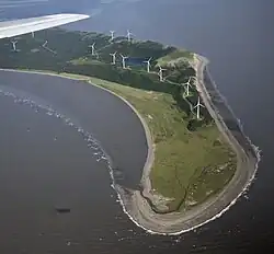 The island's wind farm began operating commercially on September 24, 2012.[10] At present, there is an 11-turbine, 17.6-megawatt wind farm located on Fire Island. The installation is owned and operated by Fire Island Wind LLC, a subsidiary of Cook Inlet Region, Inc. (CIRI), the owners of the island. The turbines’ nacelles rise to 262 feet (80 m) above the ground, about the height of Anchorage's Robert B. Atwood Building, which is the city's second-tallest. An underwater transmission line connects the wind farm to the Anchorage power grid.[11]