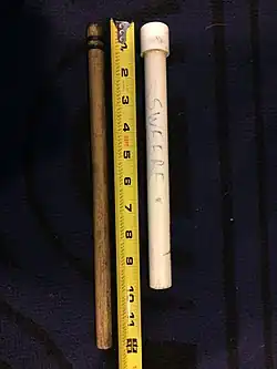 Fire pistons in Southeast Asia were variously constructed of bamboo, wood, metal, ivory, bone, and horn. The main tube was typically around 3.25 in (8.3 cm) long and 0.5 in (1.3 cm) in diameter, with a bore size around 0.375 in (0.95 cm).[7] The end of the tube usually flared out into a small cavity used for holding tinder.[2] The tinder used was typically obtained from the leaf bases of palm trees and rattan vines and were usually stored in a tinder box carried along with the piston. They were reported to be known as lek phai tok in Thai; and gobek api in Malay (lit. 'fire mortar and pestle').[8]