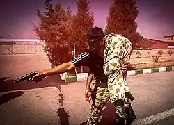 An Iranian soldier performing a fireman's carry to rescue a wounded comrade while using his pistol in a military exercise.