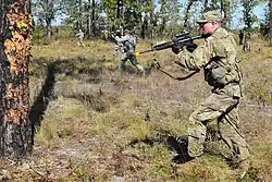 A fireteam or fire team is a small modern military subordinated element of infantry designed to optimize "NCO initiative", "combined arms", "bounding overwatch" and "fire and movement" tactical doctrine in combat.[2] Depending on mission requirements, a typical "standard" fireteam consists of four or fewer members: an automatic rifleman, a grenadier, a rifleman, and a designated fireteam leader. The role of each fireteam leader is to ensure that the fireteam operates as a cohesive unit. Two or three fireteams are organized into a section or squad in co-ordinated operations, which is led by a squad leader.[3][4][5][6][7][8]