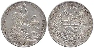 Firm and Happy for the Union (Spanish: Firme y feliz por la unión) is a motto mentioned on Peruvian currency. It first appeared on the gold 8 escudos coin in 1826 and in copper and nickel on the 8 reales coin in 1825. It was on all the currencies depicting a silver sun, from the first minted in 1863.