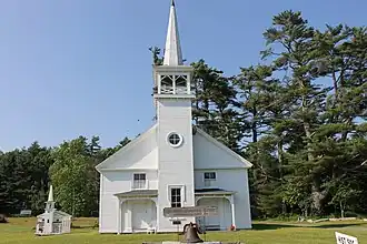 The First Baptist Church is a historic church building at 362 Lamoine Beach Road in East Lamoine, Maine. The wood frame Greek Revival building was built in 1832 by a noted local builder/architect, and was altered in 1879 to include a Victorian tower and porches. The building was listed on the National Register of Historic Places in 2001.[1]