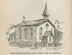 In 1841, the congregation moved to its first permanent location after being gifted land by the family of Squires McCutcheon to build a church at Queen Street and Victoria Street.[8] Soon after, white members left for a different Baptist church.[7] In 1843, Elder Washington Christian went to Jamaica for two years, returning with enough raised funds to pay off the new church's mortgage.[8] The location was known as "First Coloured Calvinistic Baptist Church" or "Queen Street Coloured Baptist Church."[7]