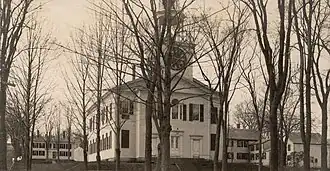 Belfast's Congregationalist church was organized in 1796, the town having first been settled in the 1770s by Scotch-Irish Presbyterians. At first sharing the meetinghouse with the Presbyterians, they built the present edifice in 1818. The design and construction were overseen by the master builder Samuel French, but are clearly based on the published work of Asher Benjamin. In 1868 it was remodeled, its original box pews removed, and gas lighting installed. The adjacent parish house was dedicated in 1926.[2]