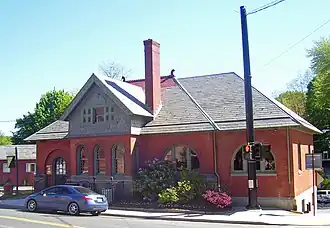 A small wing on the north facade has hexagonal slate shingles and a Palladian window on its gable face; a chimney rises from its roof. It is complemented by a similarly-faced cross-gable on the south side with louvered oculus. The slope of the irregular triangle the building sits on allows for a basement entrance on this side. A small addition on the west side is sympathetic to the original building.[1]