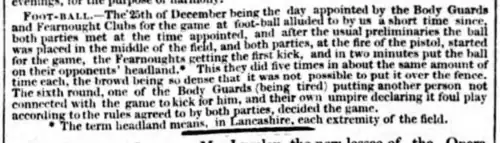 On Christmas Day 1841, an early documented match between two self-described "football clubs" took place. The Body-guard Club (of Rochdale) lost to the Fear-nought Club after using an ineligible player as a substitute.[8][9][10] The complete rules used in this game are unknown, but they specified twelve players on each side,[9] with each team providing its own umpire, and the game being started by the firing of a pistol.[10]