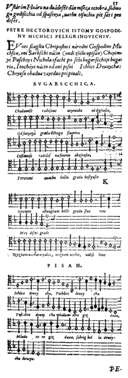 Hektorović meticulously recorded the songs sung by the fishermen along the way, making this one of the earliest examples in Croatian literature to include transcribed folk music within the text.[2] There are two bugaršćicas and three short songs, toasts or honorific songs, sung alternatively by the fishermen. This makes Ribanje a work that makes an interesting and aesthetically valuable synthesis, a blending of artistic and folk literature.