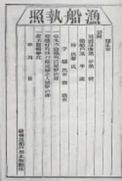 In 1765, the Chinese Qing dynasty government required all fishing boat operators to obtain a fishing license under the aojia system that regulated coastal populations. The Dan boat people of Guangdong had to acquire a fishing license as early as 1729. The wooden license issued by the government was to be displayed on the bow or stern of a boat. The information on the license consisted of the name and age of the boat's owner, the ship's status as either a fishing or commercial vessel, the home port of the boat, crew and family members on board, the date the license was issued, and the registration number of the license.[1]