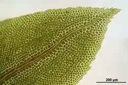 There are about 60 pairs of leaves that are slightly undulate (wavy) in texture.[4] The shape is oblong to lanceolate (narrow oval) and tapered to an acute point. Sometimes the leaf can be obtuse in shape.[4] The lamina also known as the leaf blade, is round and then narrows towards the apex.[4] The leaf margin is crenulate (finely scalloped) to regular serrulate (sawlike).[4] The marginal cells are often thinner with thicker cell walls.[4] There are about 2-3 cells in the costa.[4] The leaf cells are very turgid and irregularly round-like hexagons.[6] These leaf cells are unistratose which means they are single layered. They are also smooth and firm-walled.[4]