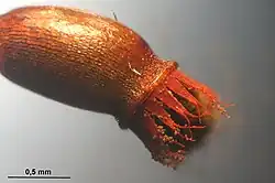 A sporophyte is the diploid multicellular stage in the life cycle of a moss which produces spores. They are commonly observed in this species. There is one sporophyte produced per perichaetium.[4] The seta, which is a stalk that supports capsule, is relatively short and is 25 mm in length. It is red-brown in colour and inserted laterally.[6] The operculum (lid) is about the same length as the rest of the sporangium.[6] The capsule of the sporophyte is inclined, curved, bilaterally symmetric and about 1.5 mm.[4] As for the calyptra, it is cucullate, smooth and about 2.5 mm. [4] The spores are about 3-22 μm.[4]