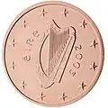 | The national emblem of Ireland, an Irish harp (the Cláirseach, see Clàrsach). Vertically on the left-hand side is the word "Éire" (Ireland in the Irish language) and on the right hand side is the date. The harp motif was designed by Jarlath Hayes. | 2002–onward |