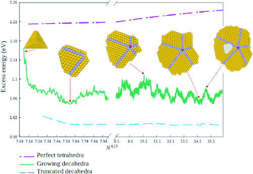 - ^ a b c d El Koraychy, El Yakout; Roncaglia, Cesare; Nelli, Diana; Cerbelaud, Manuella; Ferrando, Riccardo (2022). "Growth mechanisms from tetrahedral seeds to multiply twinned Au nanoparticles revealed by atomistic simulations". Nanoscale Horizons. 7 (8): 883–889. Bibcode:2022NanoH...7..883E. doi:10.1039/D1NH00599E. ISSN 2055-6756. PMID 35722927.