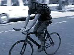 A fixed-gear bicycle or fixie[1] is a bicycle that has a drivetrain with no freewheel mechanism, meaning the pedals always spin together with the rear wheel. The freewheel was developed early in the history of bicycle design but the fixed-gear bicycle remained the standard track racing design. More recently the "fixie" has become a international subculture mainly among urban cyclists.