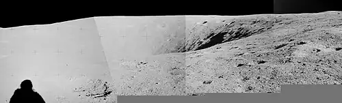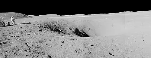 Flag crater is approximately 240 m in diameter and over 20 m deep.[2] The adjacent crater Plum is only about 30 m in diameter.[3] The slightly larger crater Spook, also visited by the astronauts, lies less than 1 km to the east.