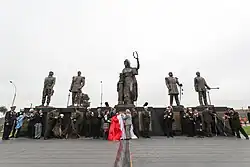 The oval-shaped square was remodelled by the Municipality of Lima in 2017, with the earthen slopes being replaced by a flatter area with gardens, concrete steps and a central flagpole.[3] In 2019, during the ceremony of the 199th anniversary of the first flag of Peru, an effigy of the Peruvian Motherland and statues of the heroes of the four branches of the Armed Forces of Peru were unveiled: Francisco Bolognesi (Army), Miguel Grau (Navy), José Quiñones (Air Force) and Mariano Santos Mateo (Police).[4]