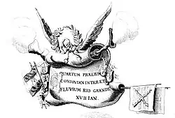 In the pictorial representations associated with Dutch Brazil, such as maps, engravings, paintings of battles, one rarely finds elements in the images that refer specifically to the West India Company (such as the monogram of the company),[8] with the flags being represented just by the tricolor stripes. In a few engravings, one finds the reference to the company or its commanders, by means of coats of arms or monograms as ornament of the illustrations.[9]